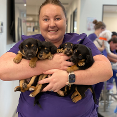 The photo shows Nurse Practitioner Kate bathing a 3 week old puppy. One of a litter of 3 who were orphaned when their mother contracted Parvo.